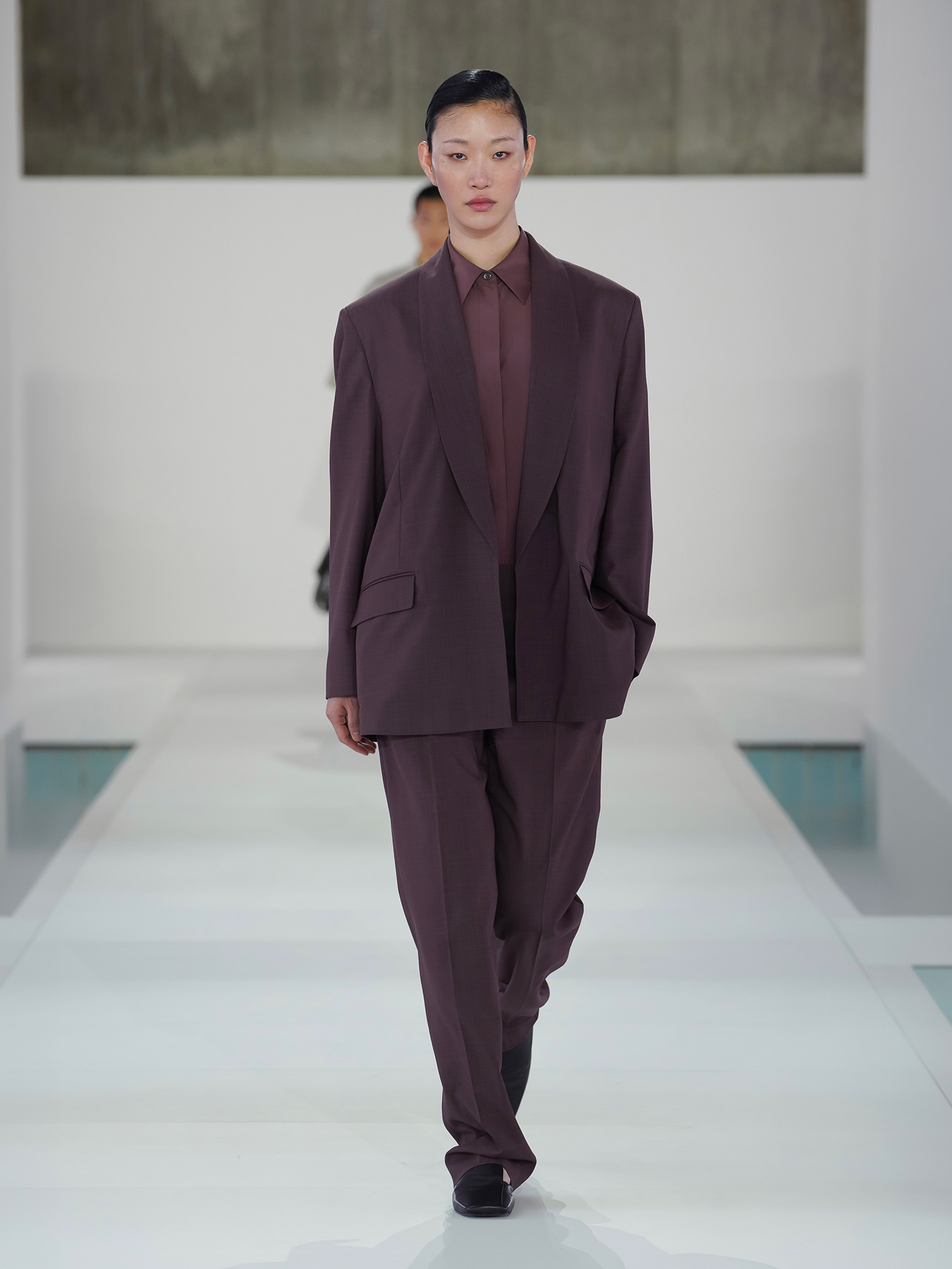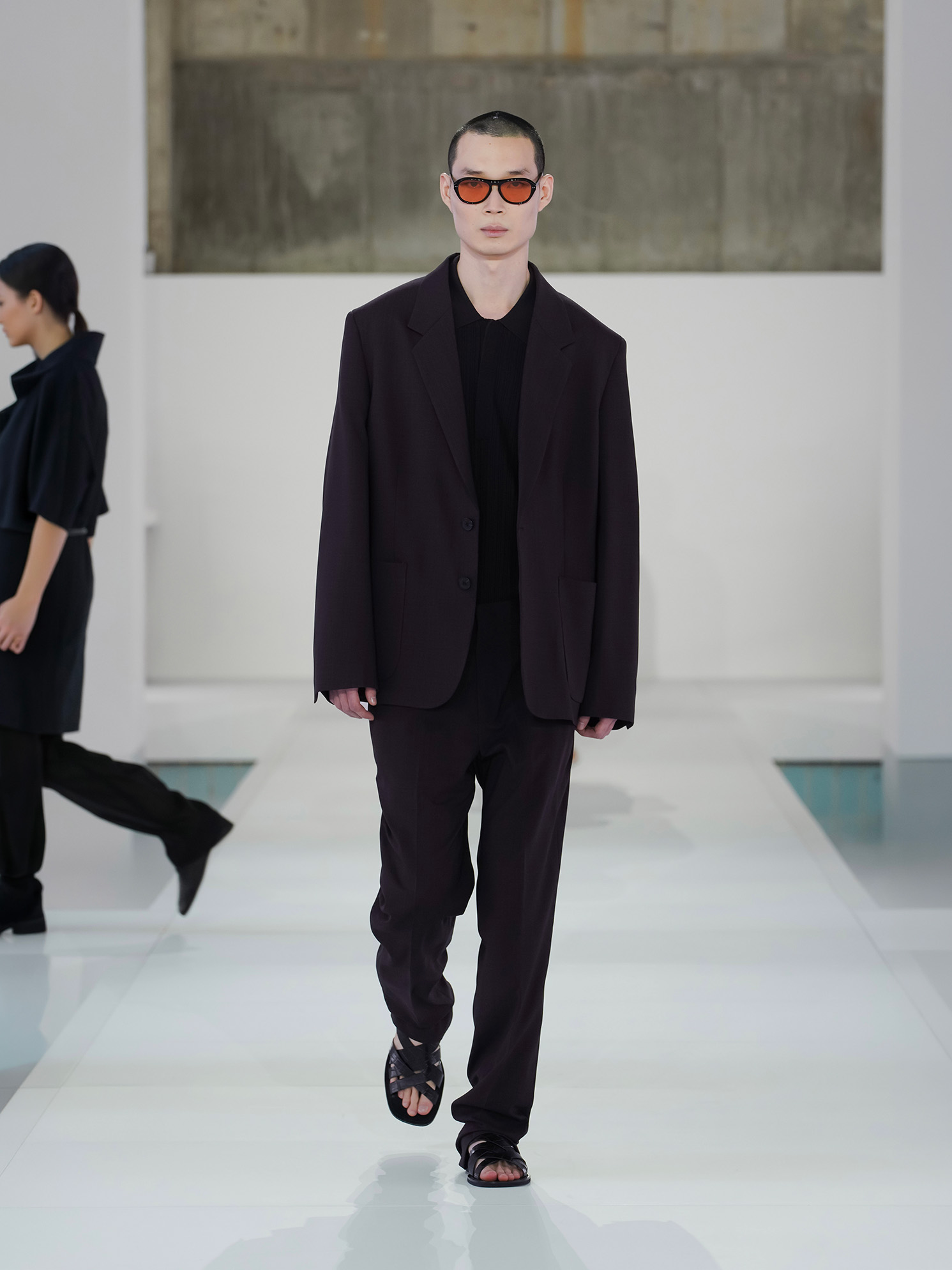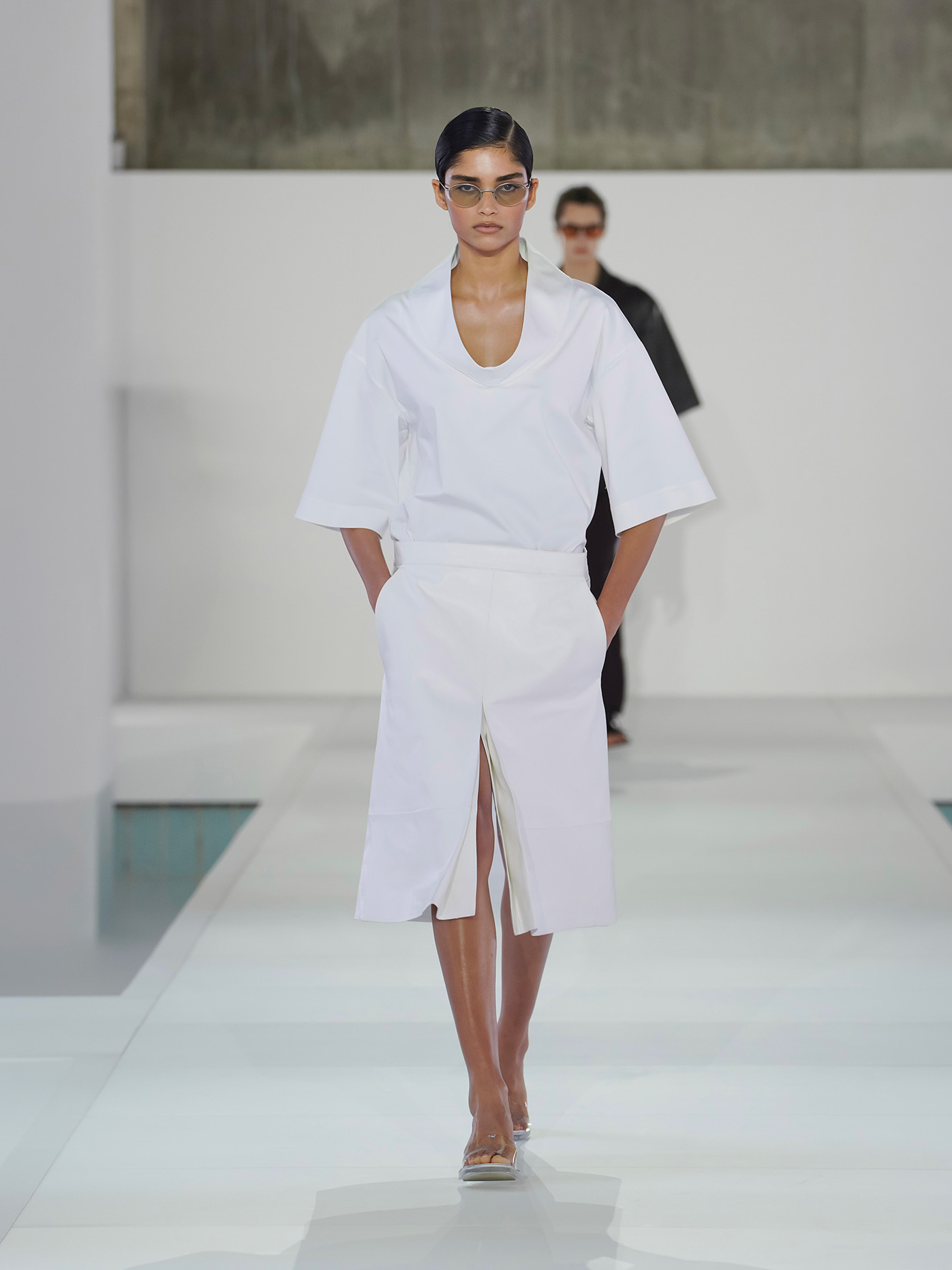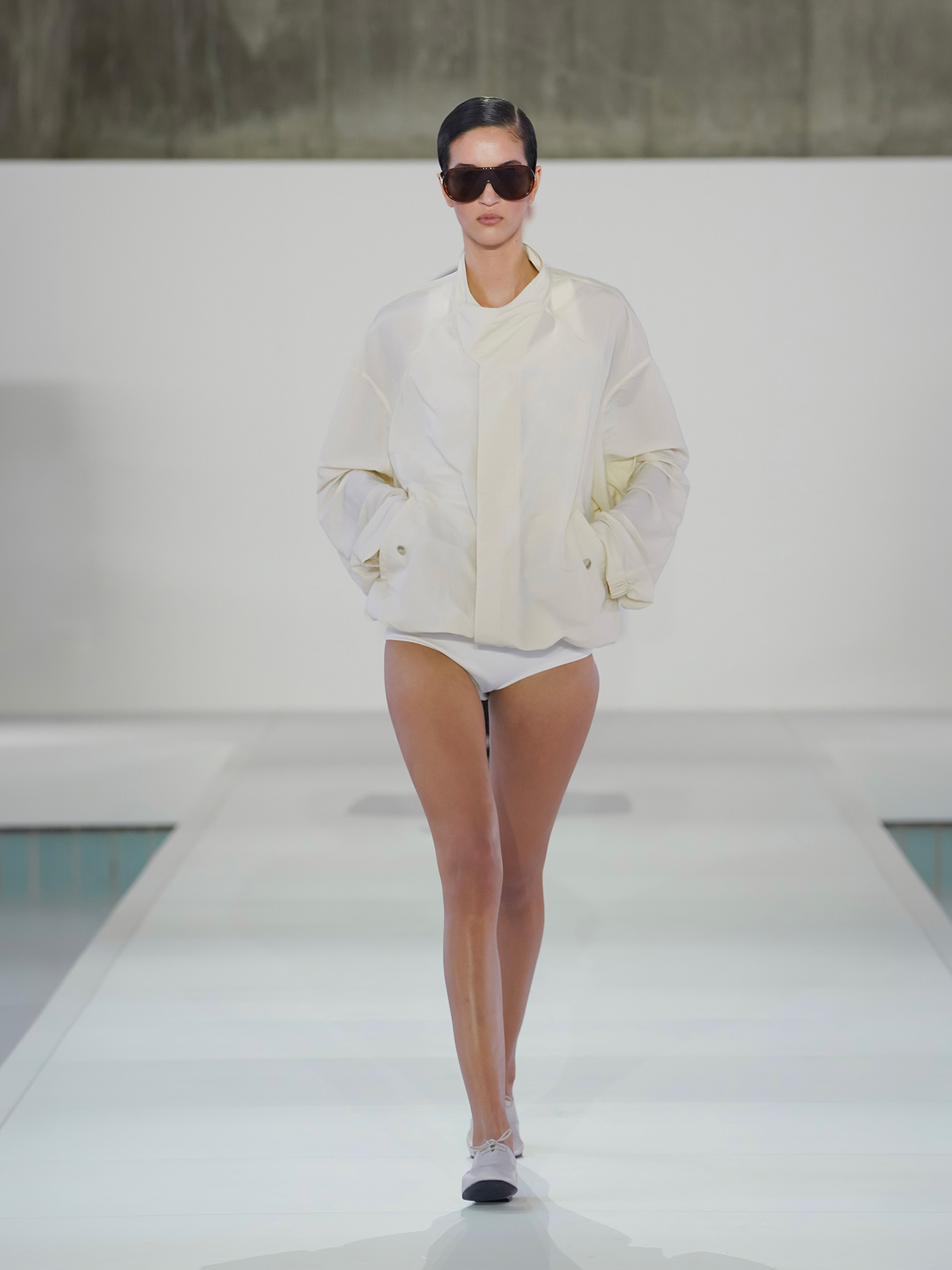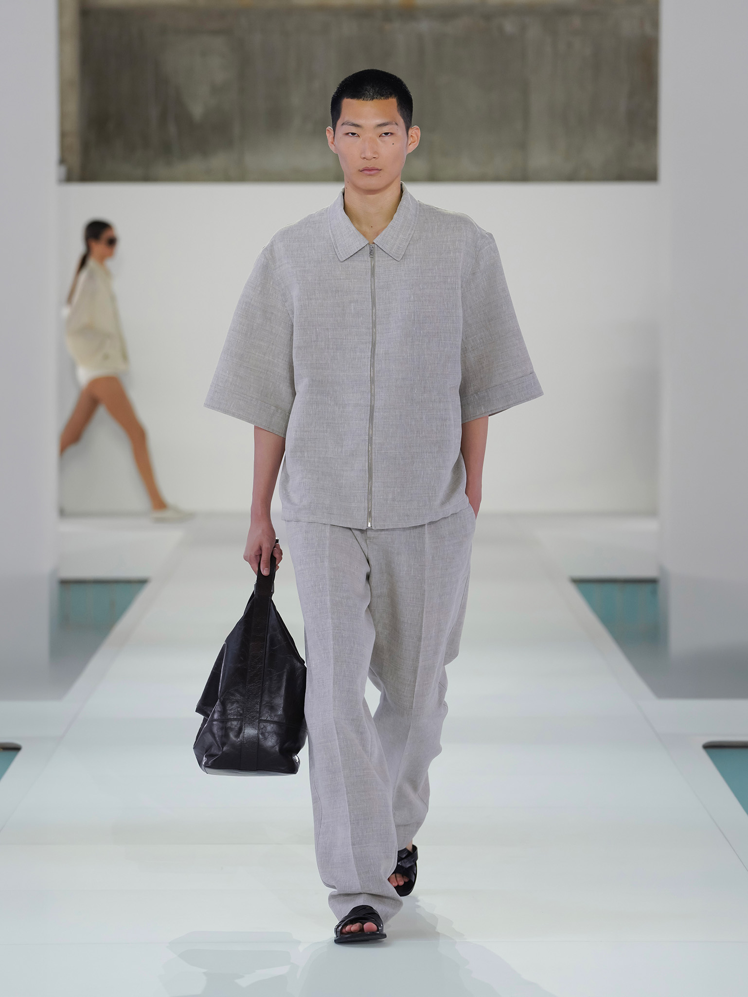 Material exploration heightens the dimensionality of the season: leather and technical fabrications carry a subtle sheen, emphasising intentional drape and sculptural form; paperlike surfaces introduce crinkled tactility; while linen melanges add textural depth. On the runway, ethereal transparency offered subtle glimpses of the body in motion, while airy, lightweight fabrics moved effortlessly, reinforcing a mood of quiet sophistication.