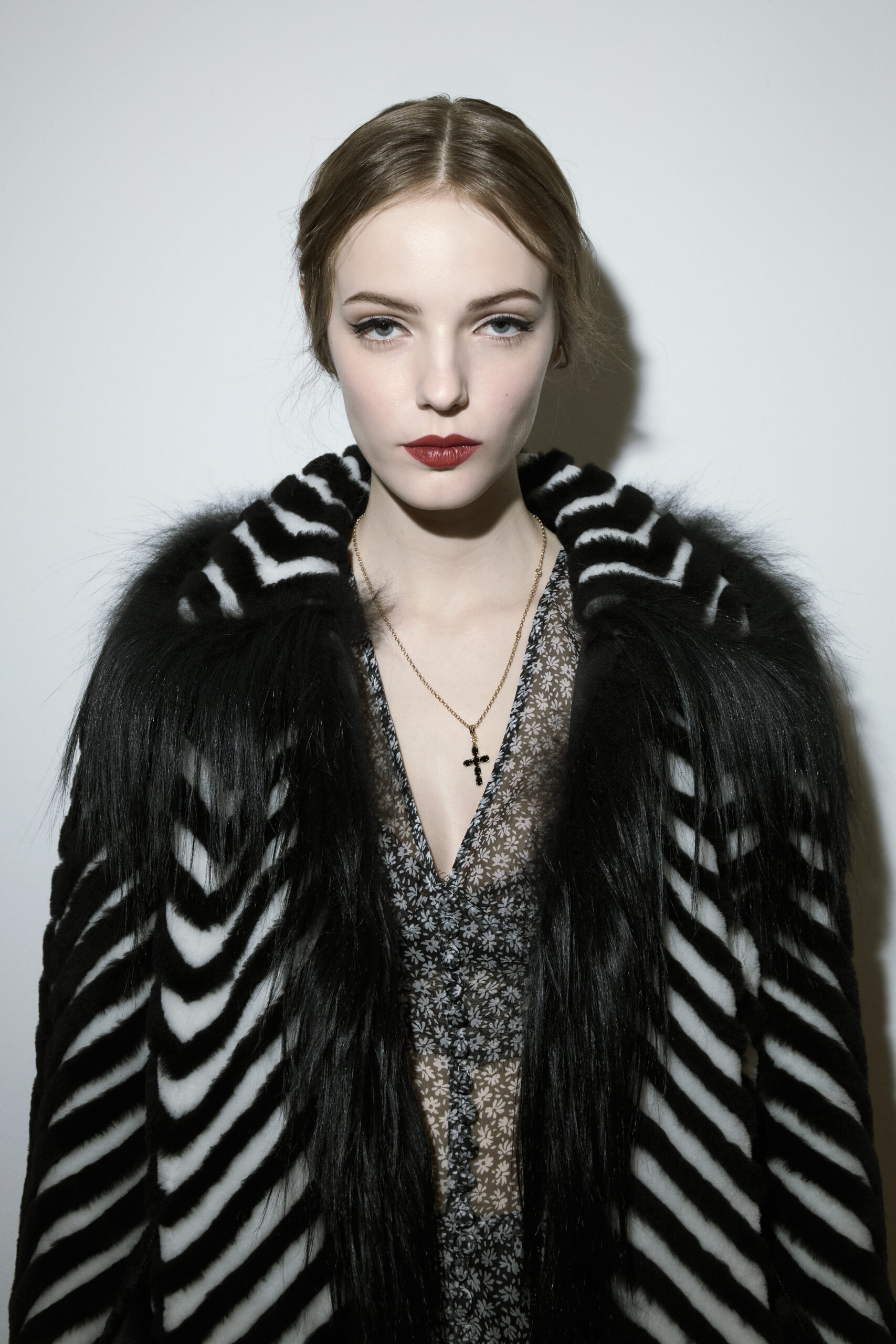 The beauty direction mirrors this clarity of vision. The makeup look enhances and amplifies each model’s distinctive charisma. Skin appears luminous and perfected, prepped to a velvety matte finish and subtly highlighted along the high points of the face for a soft halo effect.