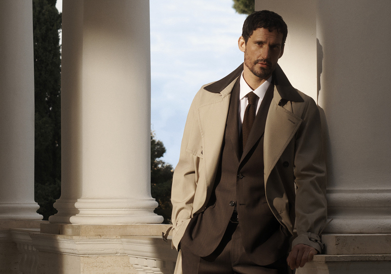 Brioni unveils its Spring/Summer 2026 advertising campaign, a visual narrative capturing a timeless atmosphere illuminated by the Roman sunsets. Set against solemn architecture, beams of light and a warm, desaturated colour palette evoke the enduring spirit of the Eternal City.