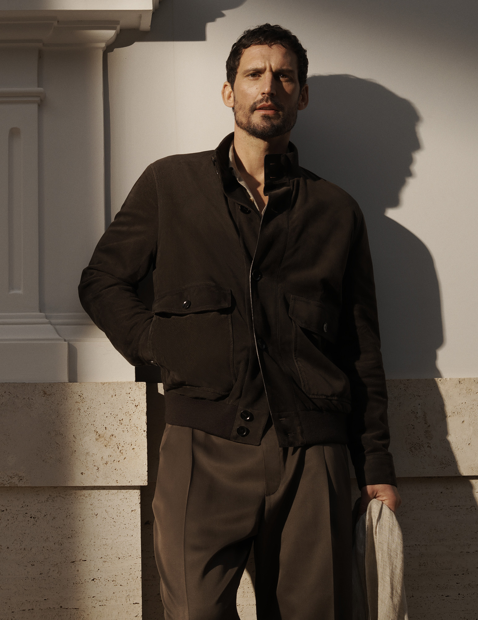 Key pieces include the soft suede jacket, emblematic of Brioni’s union of technical expertise and tactile refinement. Timeless lightweight fabrics such as Solaro, deconstructed jackets – including the iconic Soffio style, and sartorial outerwear interact with the light, enhancing texture and tonal depth.