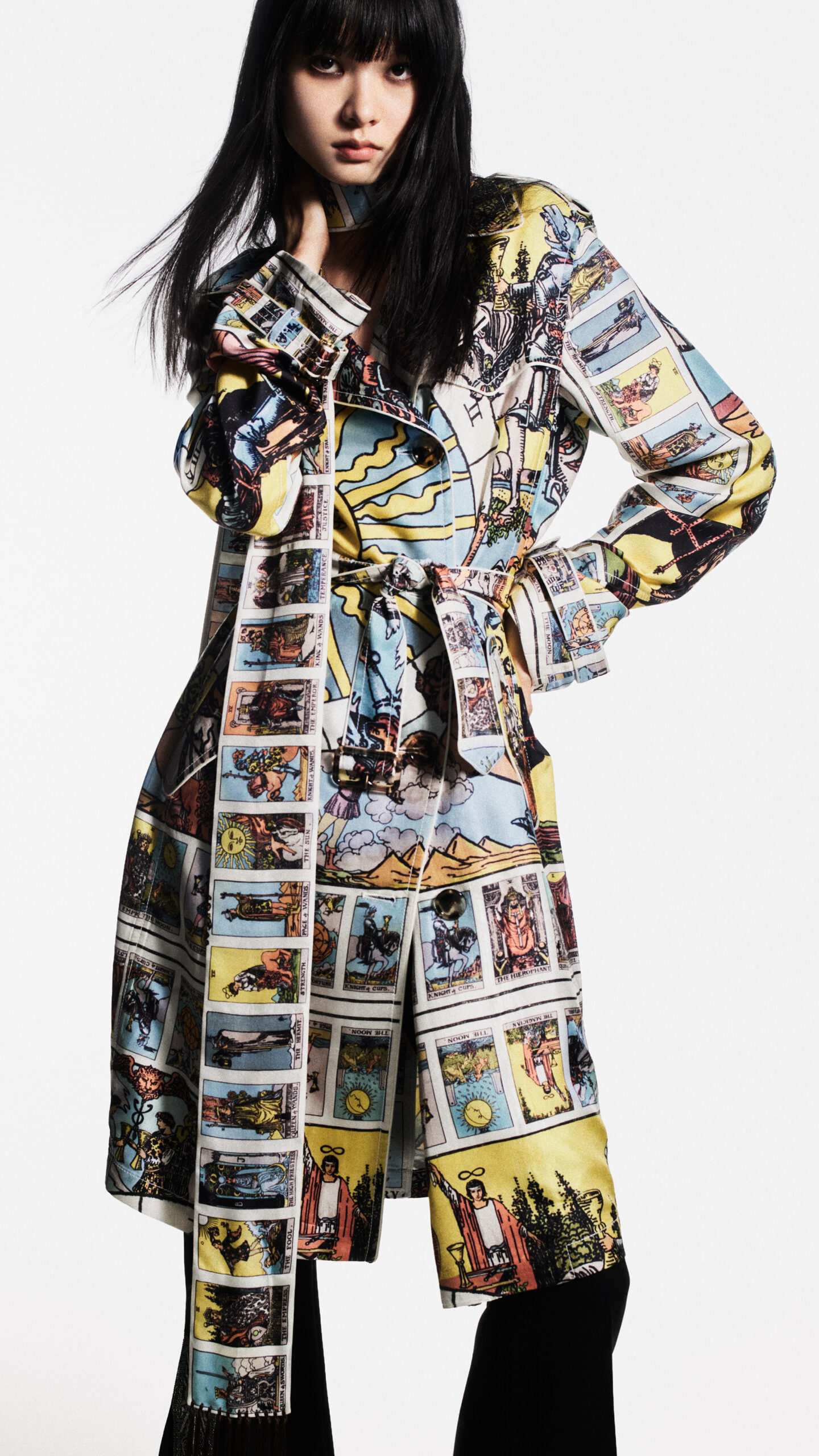 Outerwear comes in new fabrications that capture the rain-glistened haze of British summertime – printed trench coats, silk bomber jackets and oversized parkas in waxed cotton. Washed and raw denim is finished with a foil coating, while wet-look raincoats are cut from cotton and raffia-effect, woven with vibrant pops of check.