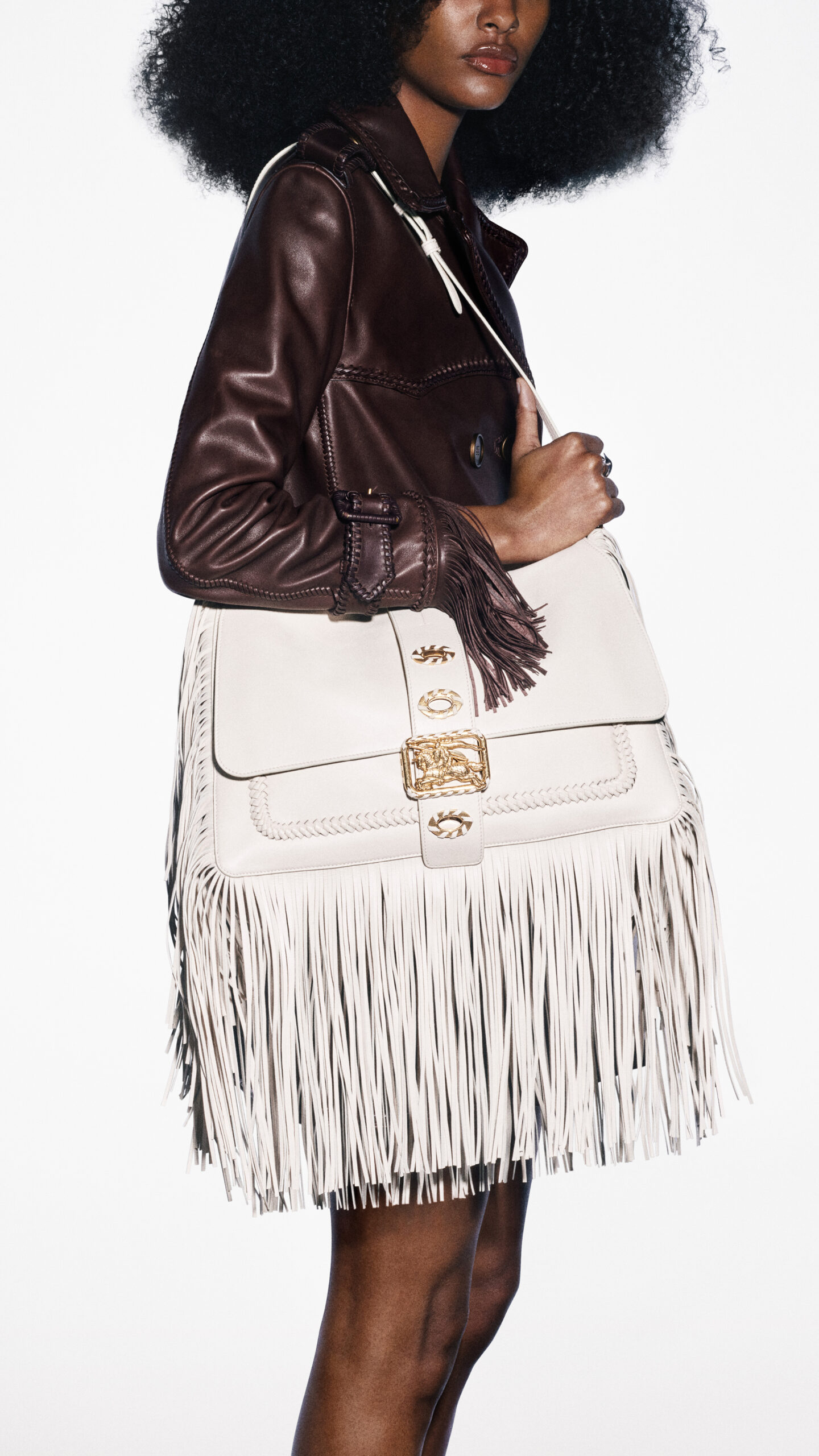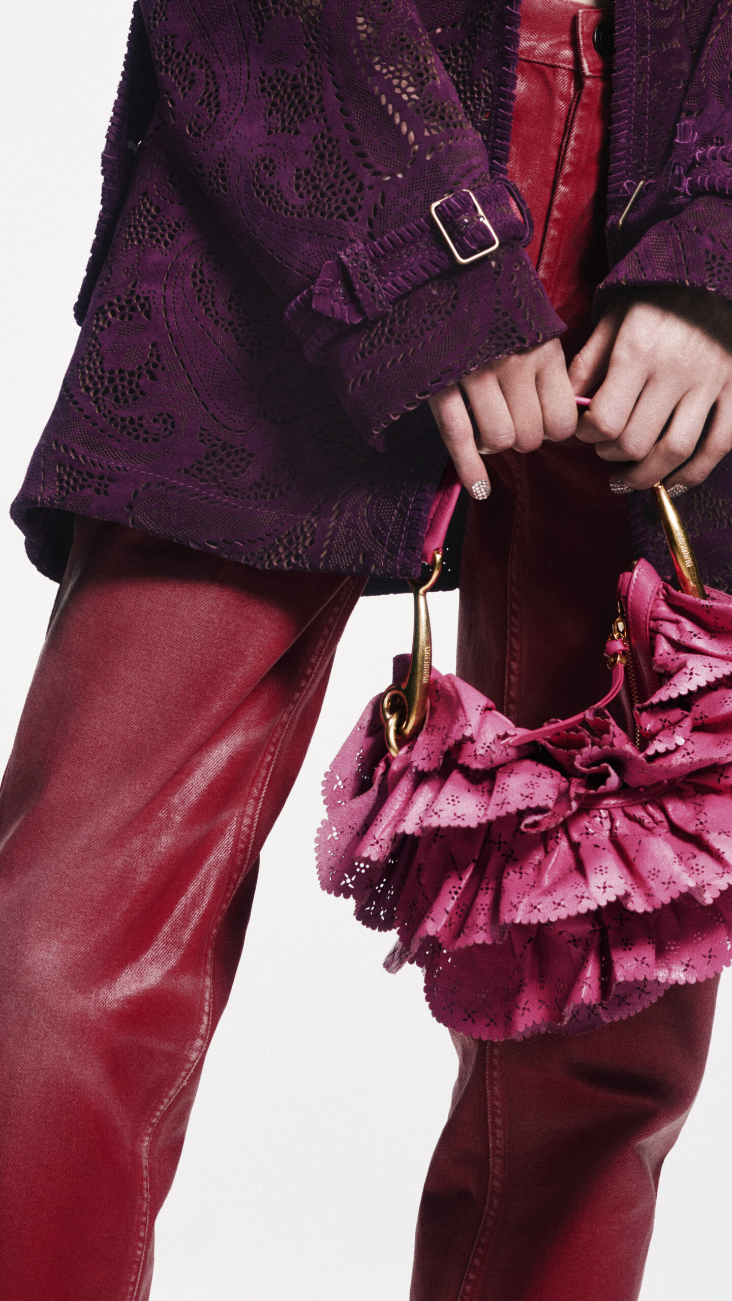 Suede and leather coats appear in python-print vegetable-tanned calfskin, paisley laser-cut to mimic lace, or detailed with whipstitching and fringing.