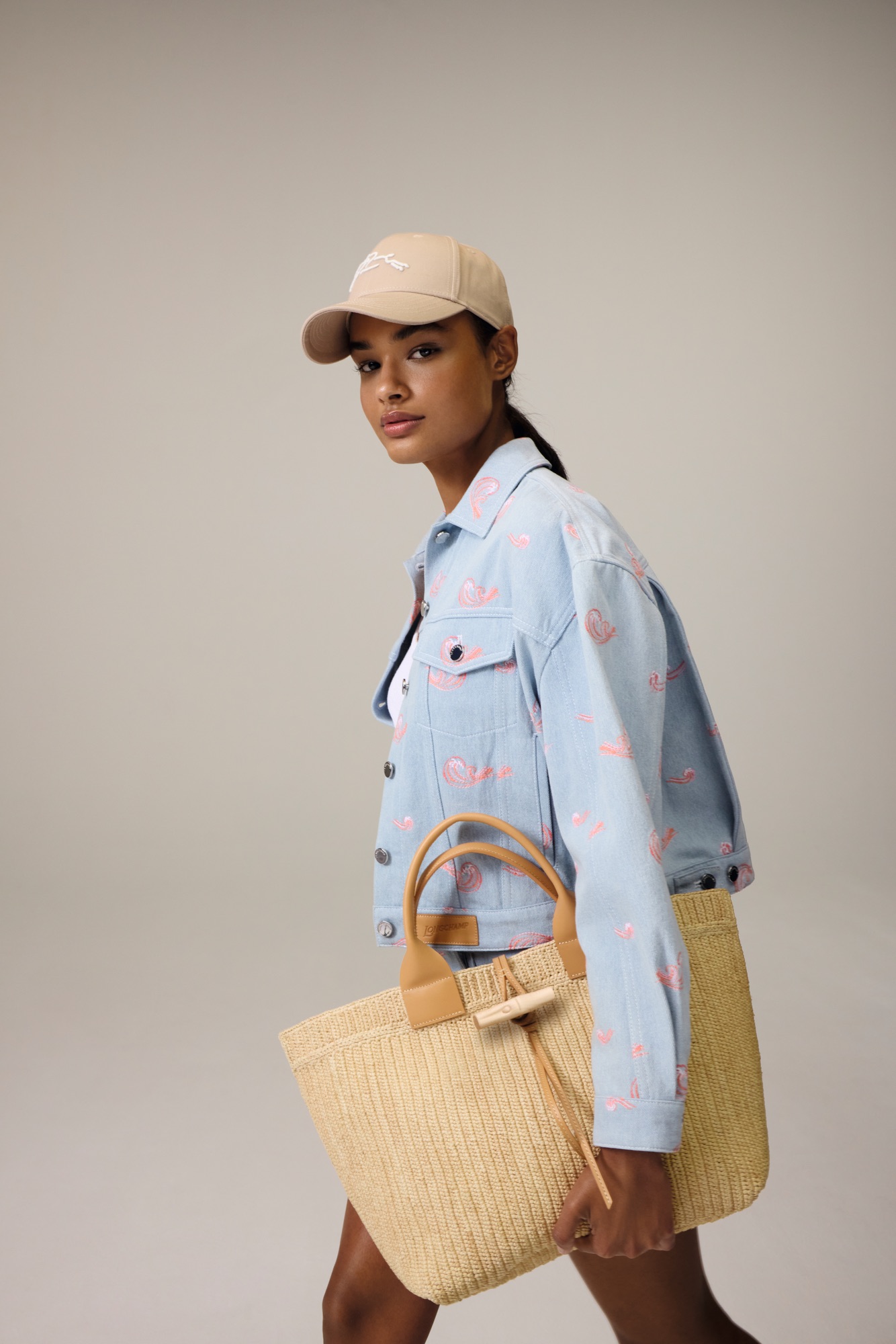 The iconography of the Summer 2026 collection dives into an ocean of references to surf culture: the Longchamp horse transforms into a rearing steed and rides the waves of cool on a pop-style crest with the motto “Catch the Parisian Wave”. The season’s key pieces are a faded denim jacket embroidered with waves, a dress printed with overlapping surfboards, an overshirt worn with bloomer shorts.Tweed, knit and cotton come in gradient rainbow shades, sunset hues or multico- lored madras, creating a vibrant, graphic kaleidos- cope on the ready-to-wear.
