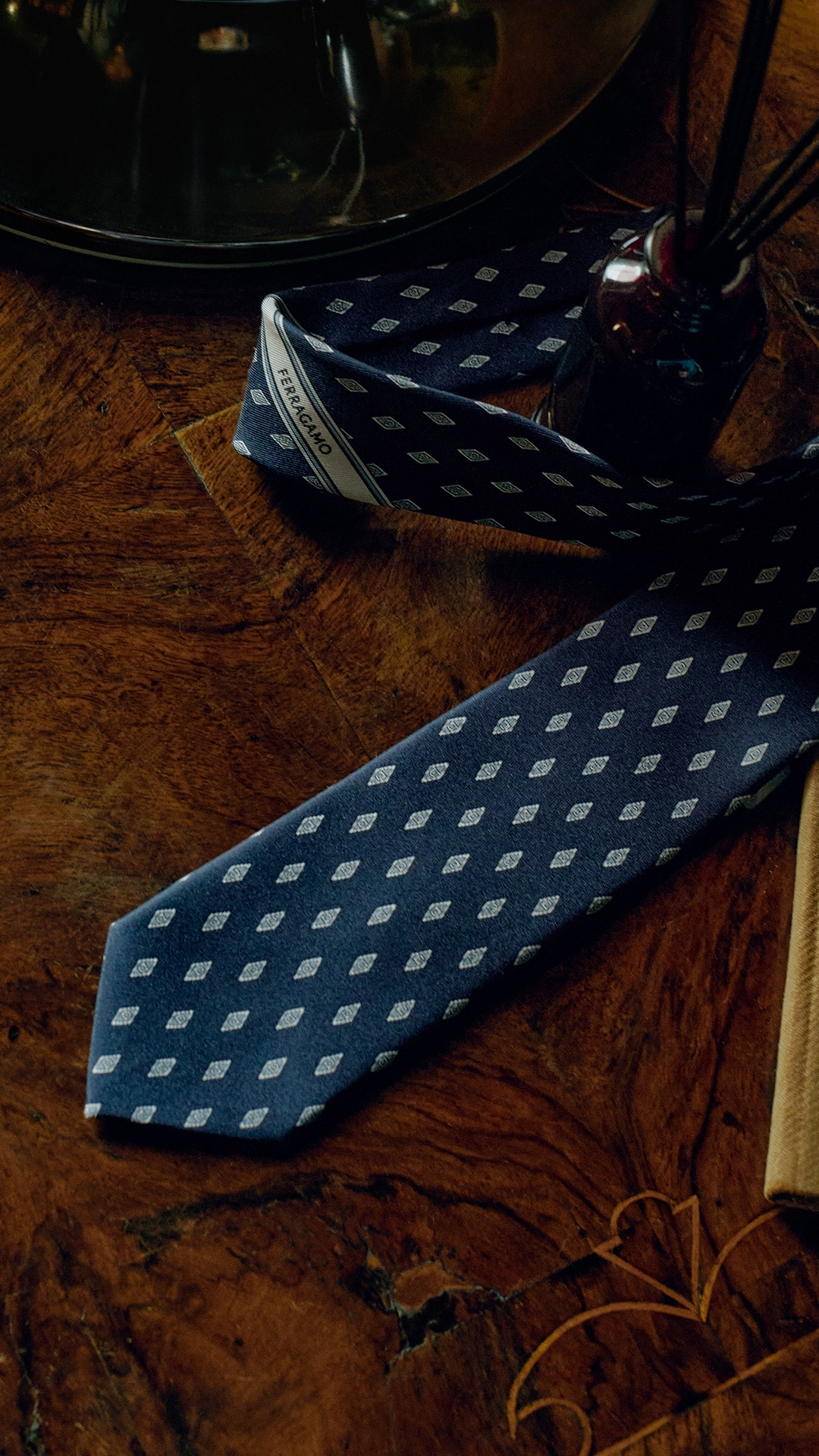 For men’s, next to the soft and informal loafer in a warm light brown, and a selection of jacquard ties, the classic black lace up with Tramezza construction, the finest expression of shoemaking, a process requiring over 160 handcrafted steps – a testament to the distinction of Made in Italy. These items honor the past while speaking to the present—sophisticated, versatile, and unmistakably Ferragamo.