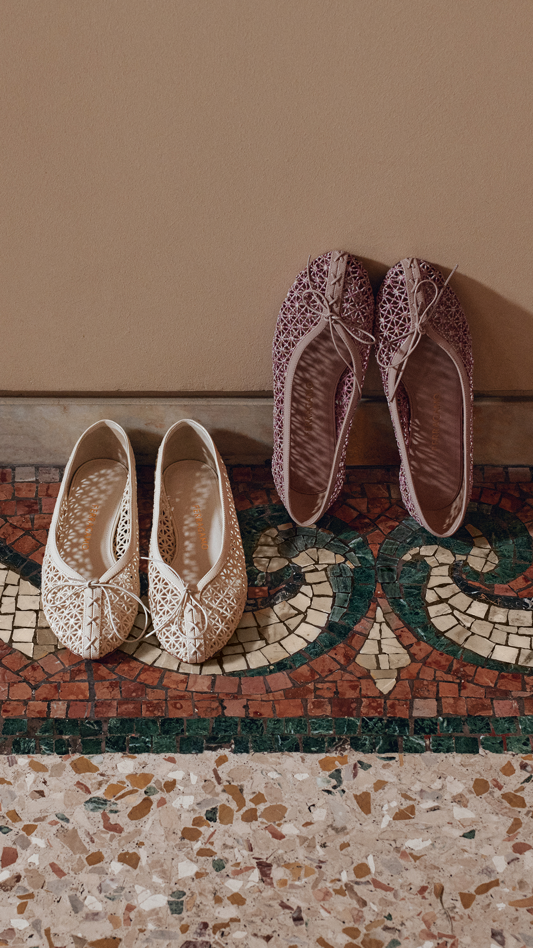 Drawing inspiration from Ferragamo’s rich archival heritage, the collection showcases signature design codes reimagined with contemporary refinement. The Vara bow—a house emblem since 1978—graces multiple silhouettes, from luminous metallic slingback sandals and ballerinas to embellished pumps with the Vara bow adorned with degrade applications of crystal on satin, or macramé lace low heel pumps and flats in soft tones.