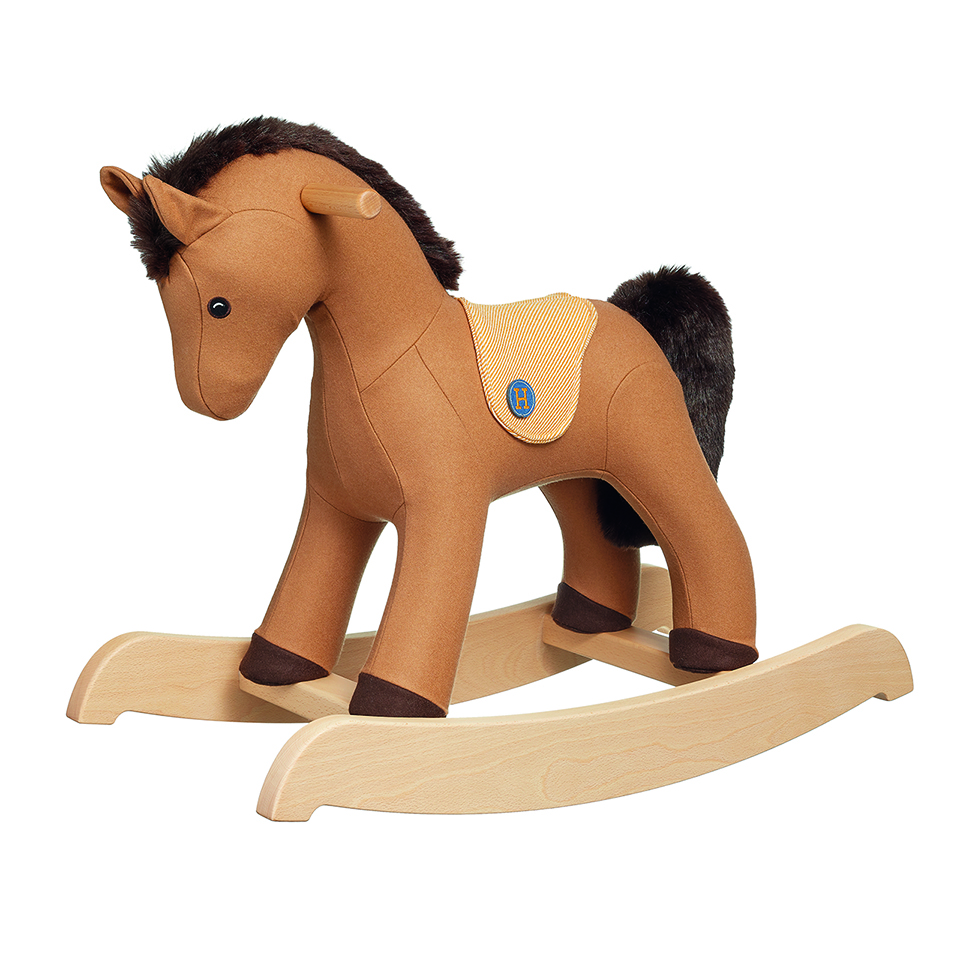 Once upon a time there was a painted wooden horse. Adopted by the Hermès family in the 19th century, it was installed in the 1980s in the centre of the 24 faubourg Saint-Honoré store, where it became the friend of all children. This collection piece has inspired the comfortable rocking horse known as Hermy. Created in 2003, it is adorned this season with a saddle in wool twill, decorated with an embroidered patch.