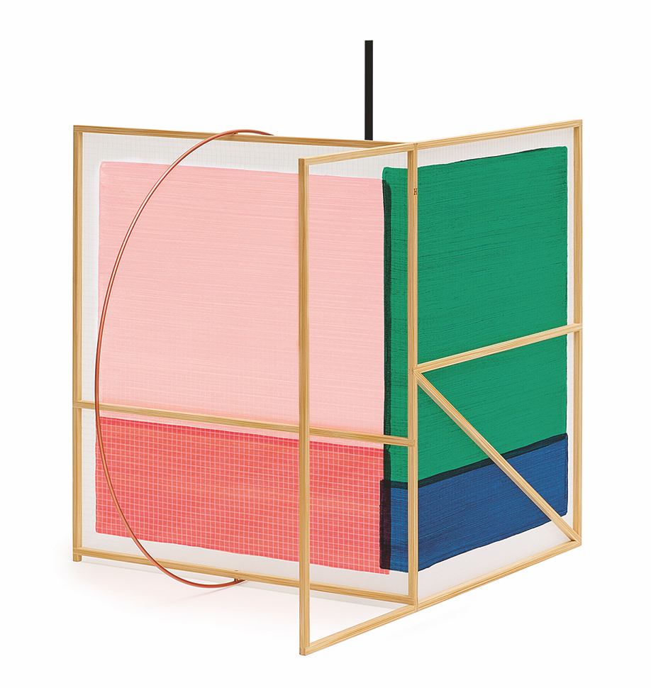 For this ambient table lamp, Spanish designer Tomás Alonso took inspiration from the panels used as stage decorations for theatrical perfor- mances. At the crossroads of sculpture and func- tional object, these lights in soft and contrasting colours summon a geometry of simple forms:circle, rectangle, and triangle. Hand-painted para- chute canvas, a bamboo frame, a light source, and a connecting circle in copper-plated steel give shape to a space in a play of shadow and light. Crafted by Japanese master cabinetmakers, the bamboo frames are incredibly light.