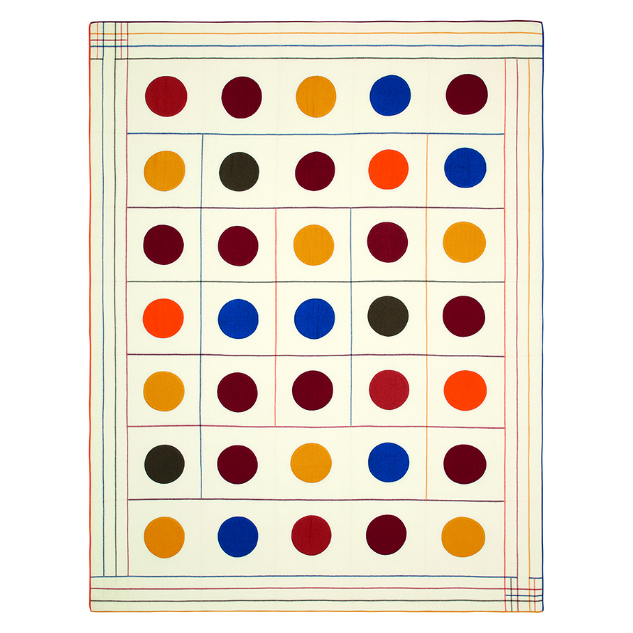 The large Points et plans throw designed by Sudanese artist Amer Musa evokes a draughts- like game. On the gridded weft in hand-wovencashmere, multicoloured polka dots are applied using a needlework technique.