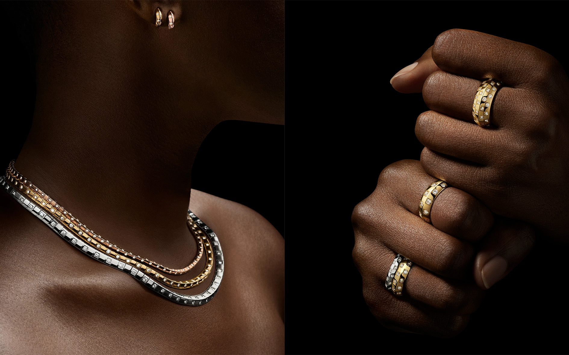 Recalling the Damier motif with a polished gold finish that exudes softness and sensuality, all the jewels are notably hand-set with round diamonds in slightly oblique squares, accented with four grain settings. A signature geometric central line anchors the collection, bringing a unique sharpness to the design. For ultimate movement and continuity, the construction of the bracelets and necklaces are crafted