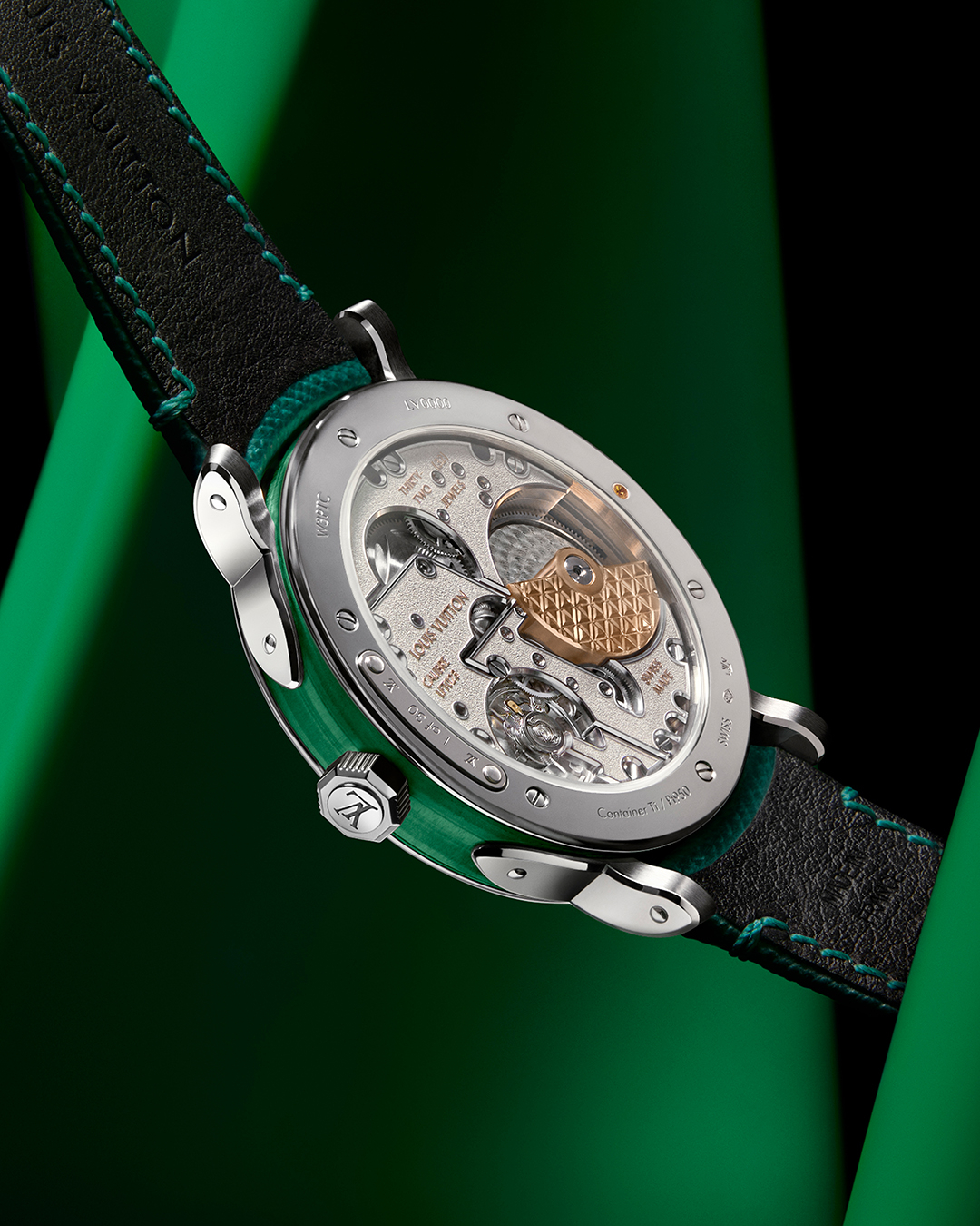 The new Louis Vuitton Escale models feature dials of turquoise and malachite, decorative minerals prized for their vibrant colour and aesthetic appeal, each limited to 30 pieces. In a true stroke of master craftsmanship, the 40mm case incorporates a seamless, monolithic ring crafted from the same mineral used in the dial. The lugs, bezel, caseback and crown are in platinum, the noble metal bringing out the natural splendour of the turquoise and malachite elements.