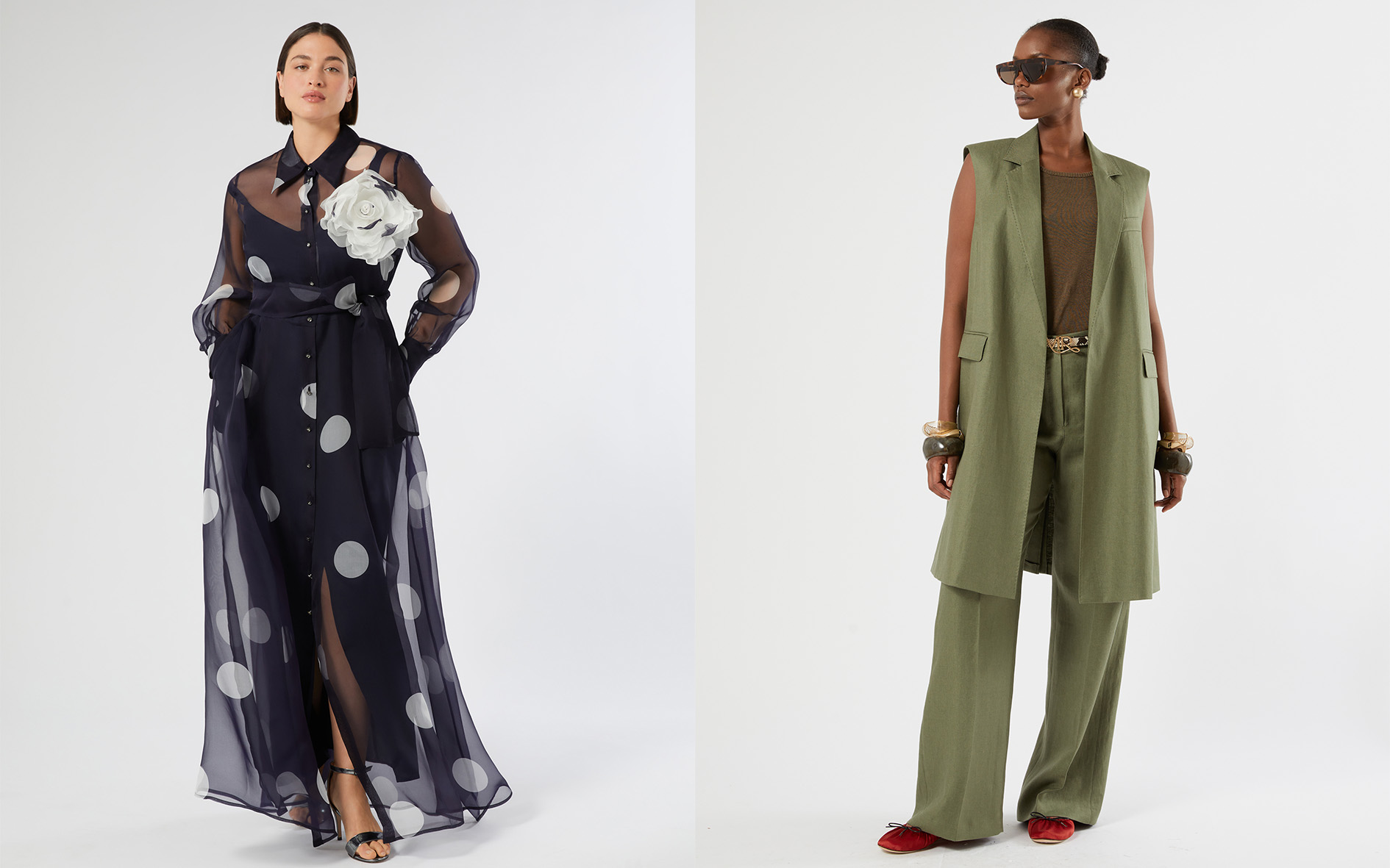 Linen, cotton, satin and silk georgette are the fabrics for the summer wardrobe, which complements more formal daywear proposals with flowing cape dresses, casual leisure robe manteaux and sophisticated beachwear proposals.