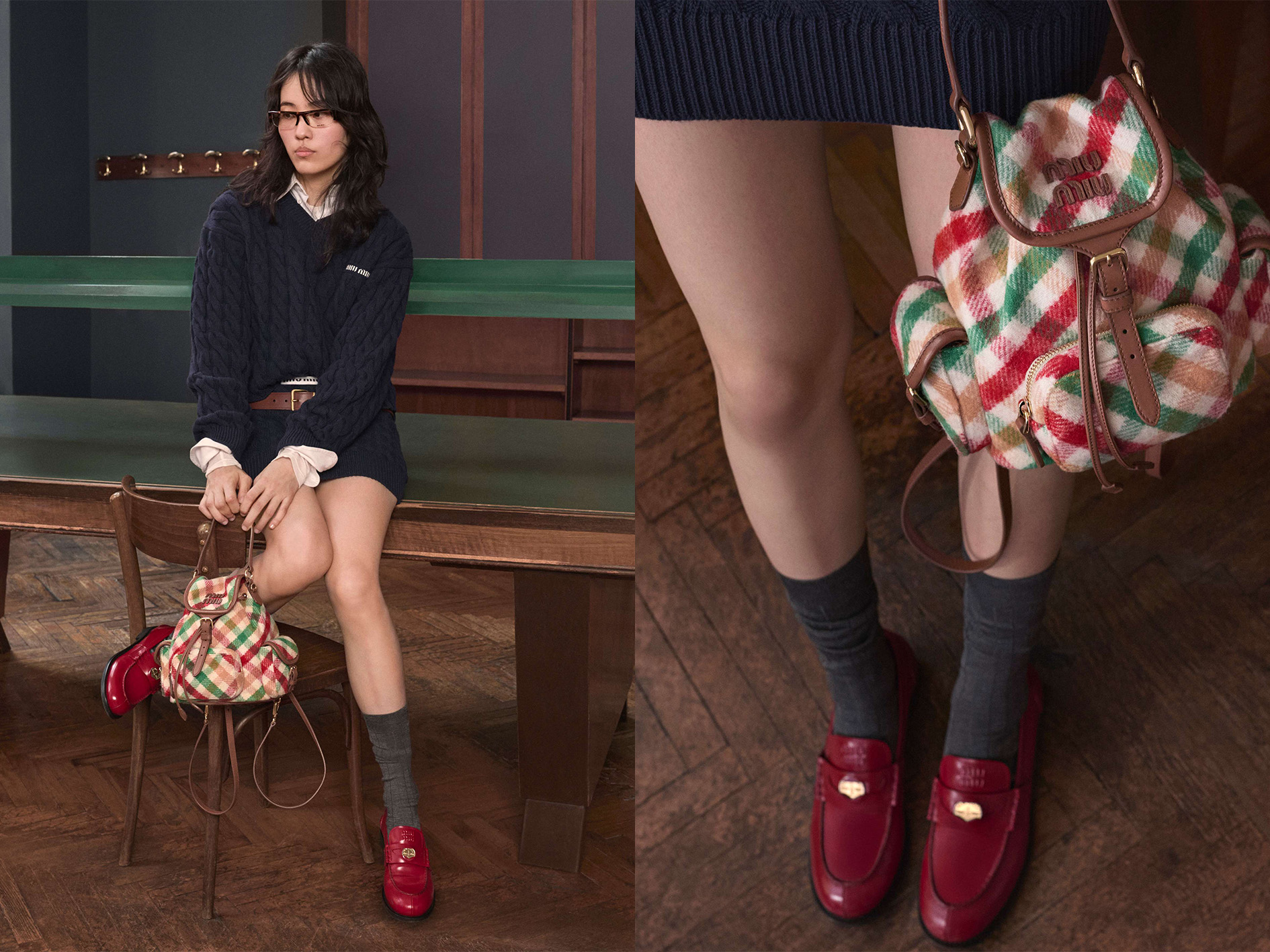 Bags add depth to the collection. Iconic styles include the Pocket bag line, combining practicality and style with a distinctive, functional design and versatile backpacks – a mini backpack will be presented especially for the occasion, as well as a new color patch leather featuring a collage construction to enhance the variety of materials; Newly introduced, from the latest Miu Miu runway, the Solitaire bag and a new bowling style. Nappa matelassé adds further richness to the offering, while check motifs echo the fabrications of the clothing.
