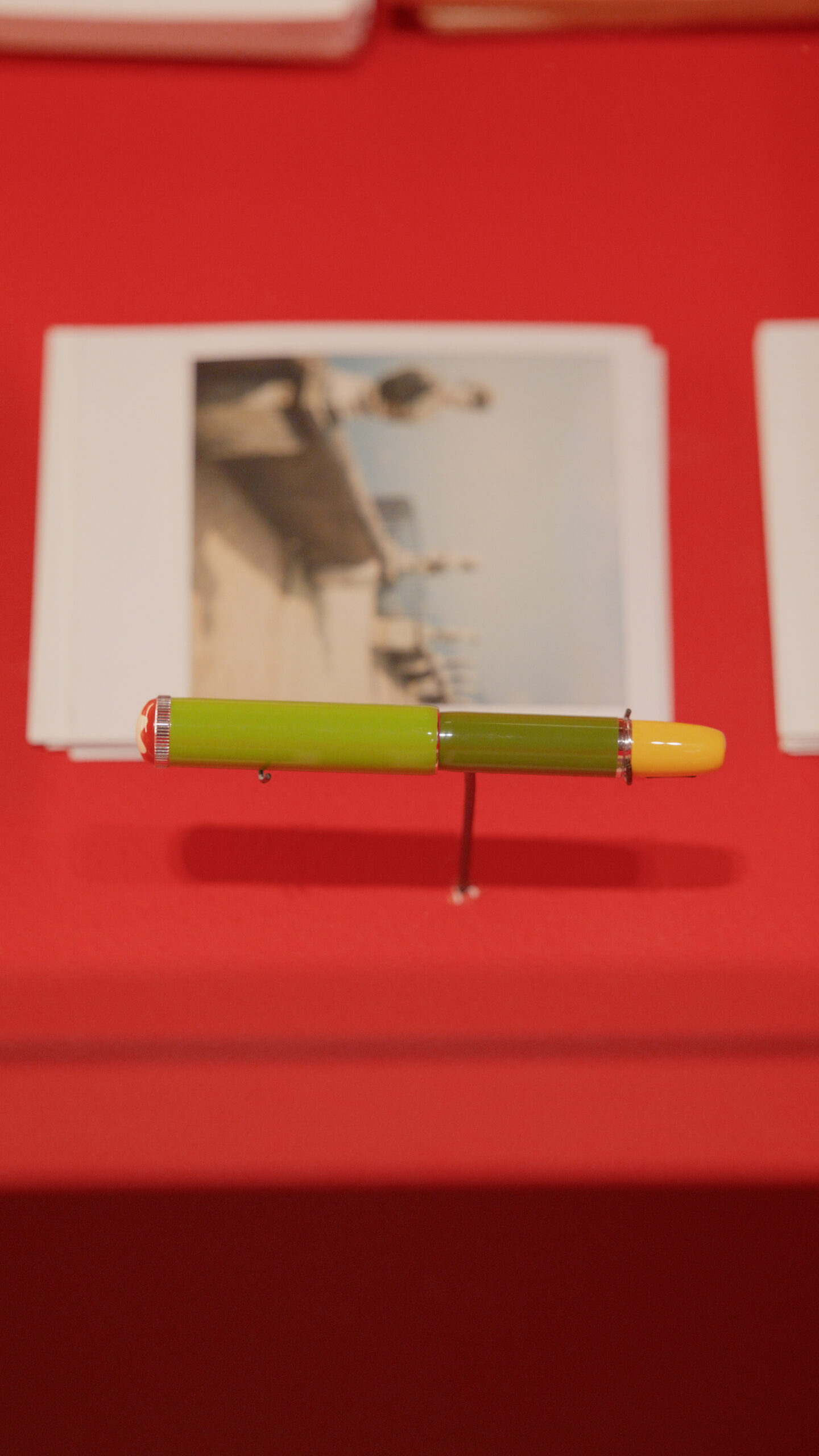 As part of the exhibition, the “SCHREIBERLING”, a writing instrument created by Wes Anderson for Montblanc, will be on display. Limited to just 1,969 pieces — paying tribute to the filmmaker’s year of birth — it features vibrant green and yellow lacquer and is crowned with the Montblanc emblem surrounded by coral-coloured precious resin, a nod to one of the Maison’s early iconic designs.