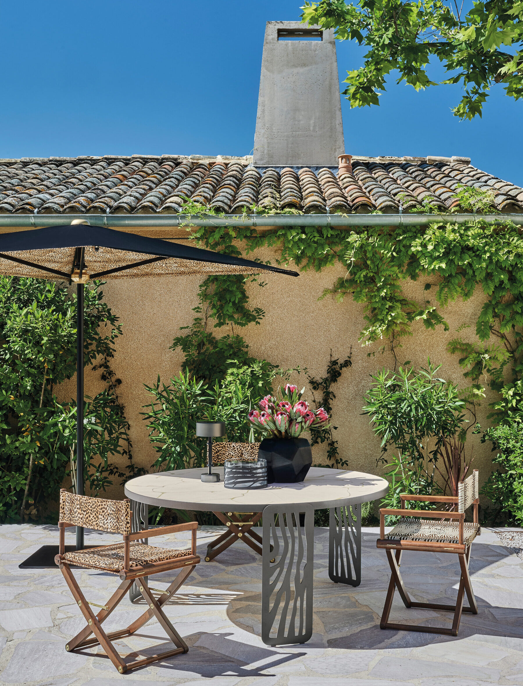 Natural inspiration and African references characterize the sculptural Kalahari dining table and low table. Their base is made of calendered iron, with a laser-cut pattern that recalls both the iconic animal motifs and the desert dunes evoked by the collection name. The top in porcelain gres lends a natural and elegant touch to the whole, while the use of technical materials makes the pieces functional for outdoor use.