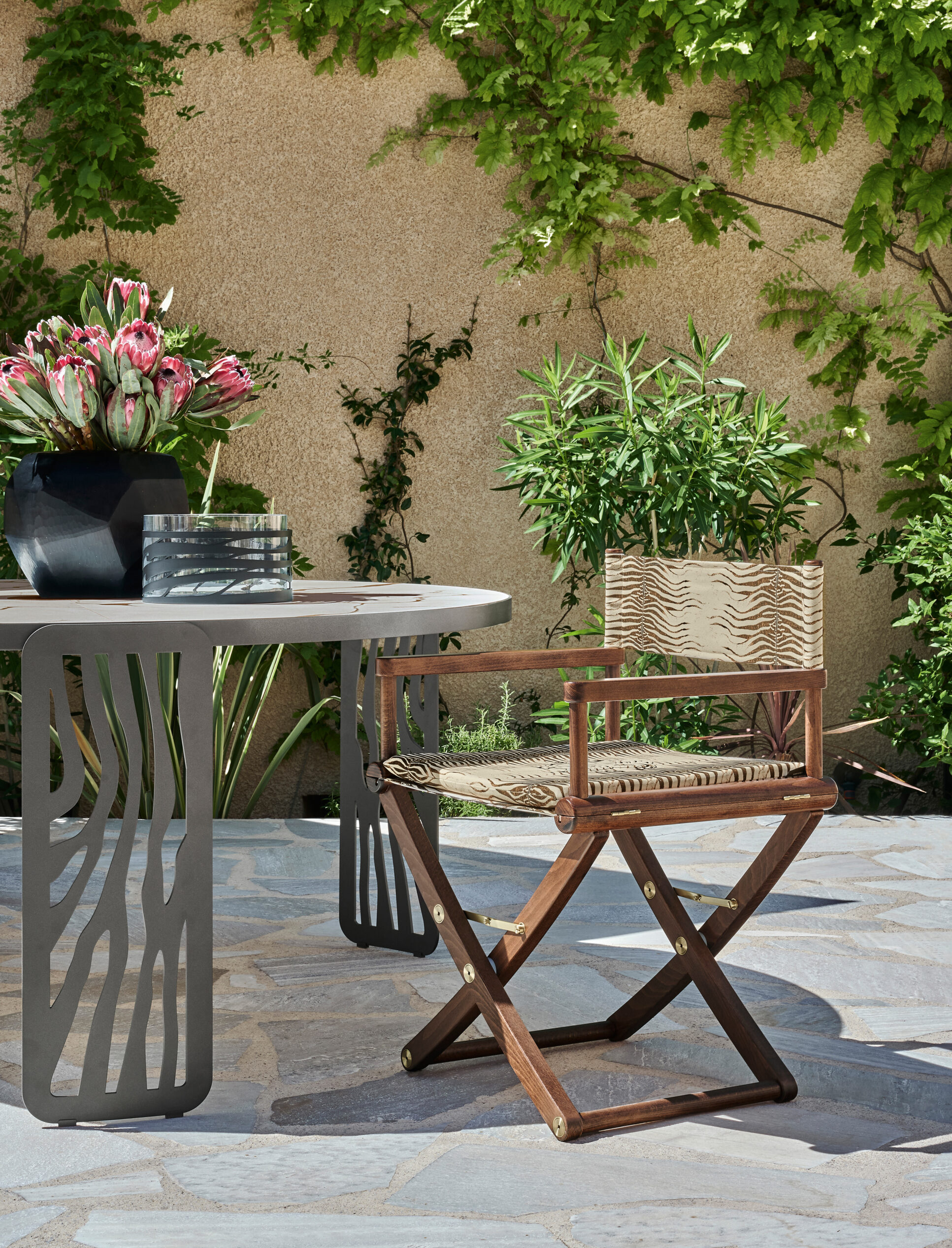 The classic director chair from the collection is revisited in an outdoor version with the typical Cavalli stylistic hallmarks. Compact and functional, the Capoverde chair consists of a wooden structure with gold metal details and a fabric upholstery in the prints and colors of the outdoor line.