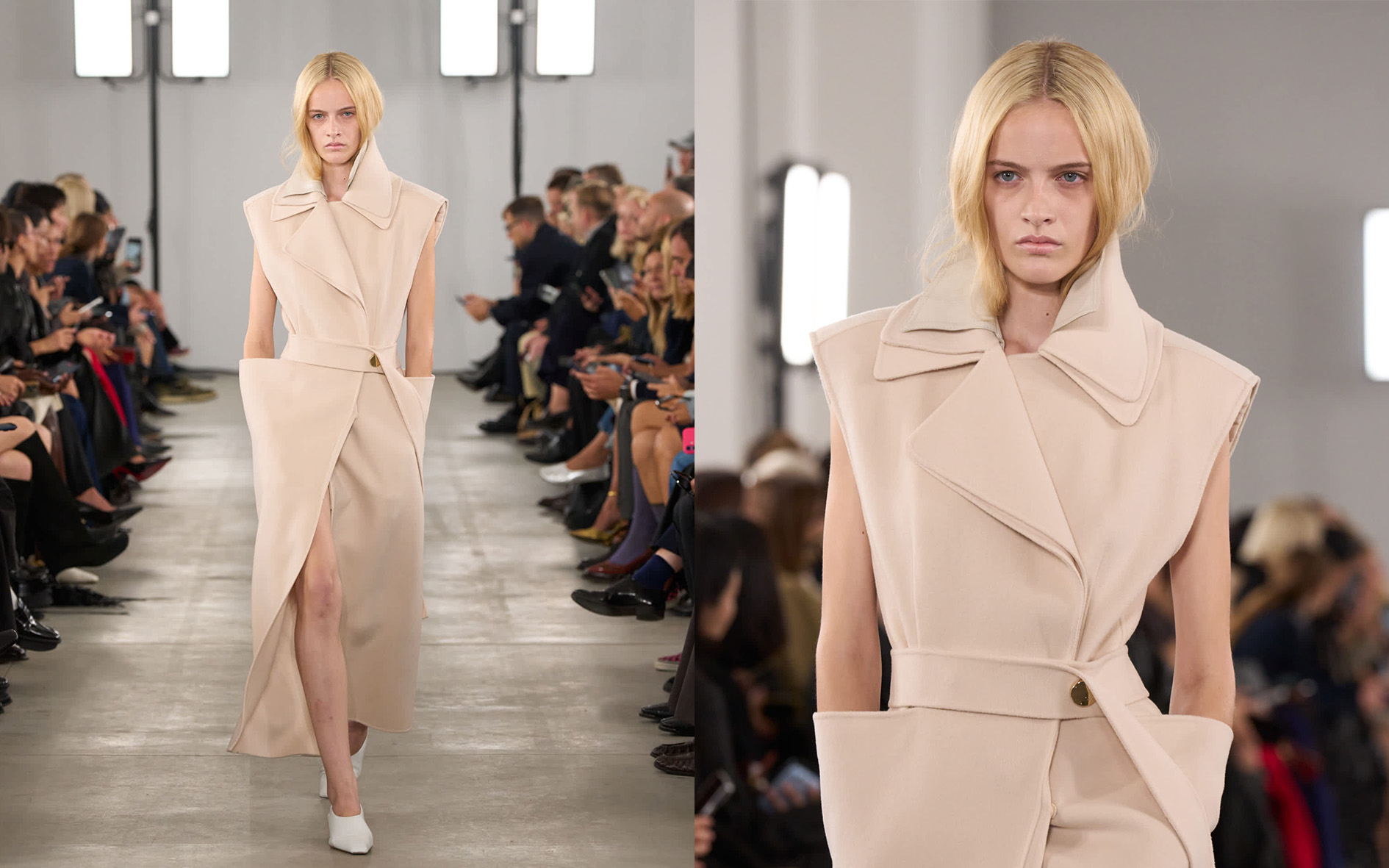 The collection embraces dreaminess without losing its footing, a fantasy grounded in the practical realities of urban life. Through fabrics that respond to movement and light, fluidity and lightness become the guiding principle. Organza emerges in unexpected applications: a classic trench coat, sheer trousers that maintain their structure, and as weightless linings that transform the feel of tailoring and outerwear. The iconic doublé wool and soft glove leather provide solid grounding, fashioned into archetypal essentials designed for infinite recombination.