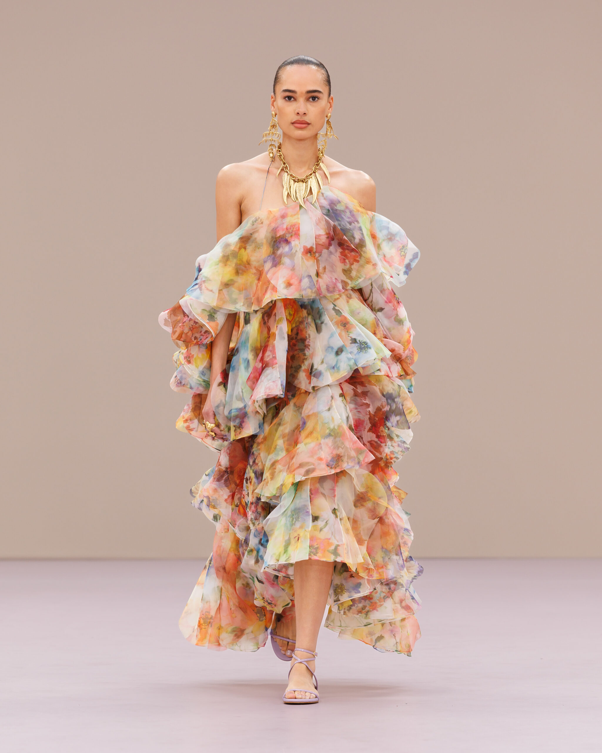 Zimmermann continues to evolve its house codes between its international design studios — combining its Sydney atelier’s aptitude for flowing gowns and exquisite original artwork, with Paris’s unerring eye for suiting and denim. The brand’s signature billowing sleeve takes shape in undulating floral organza, and in crisp ivory poplin that blooms at the shoulder and flares from the elbow. High craft continues through the development of a texture Zimmermann dubs ‘super-fluff’ — countless layers of organza cut on the bias and ruched together. Backed with crinoline, the detail erupts as uber-fluffy tiers on bouncing gowns.
