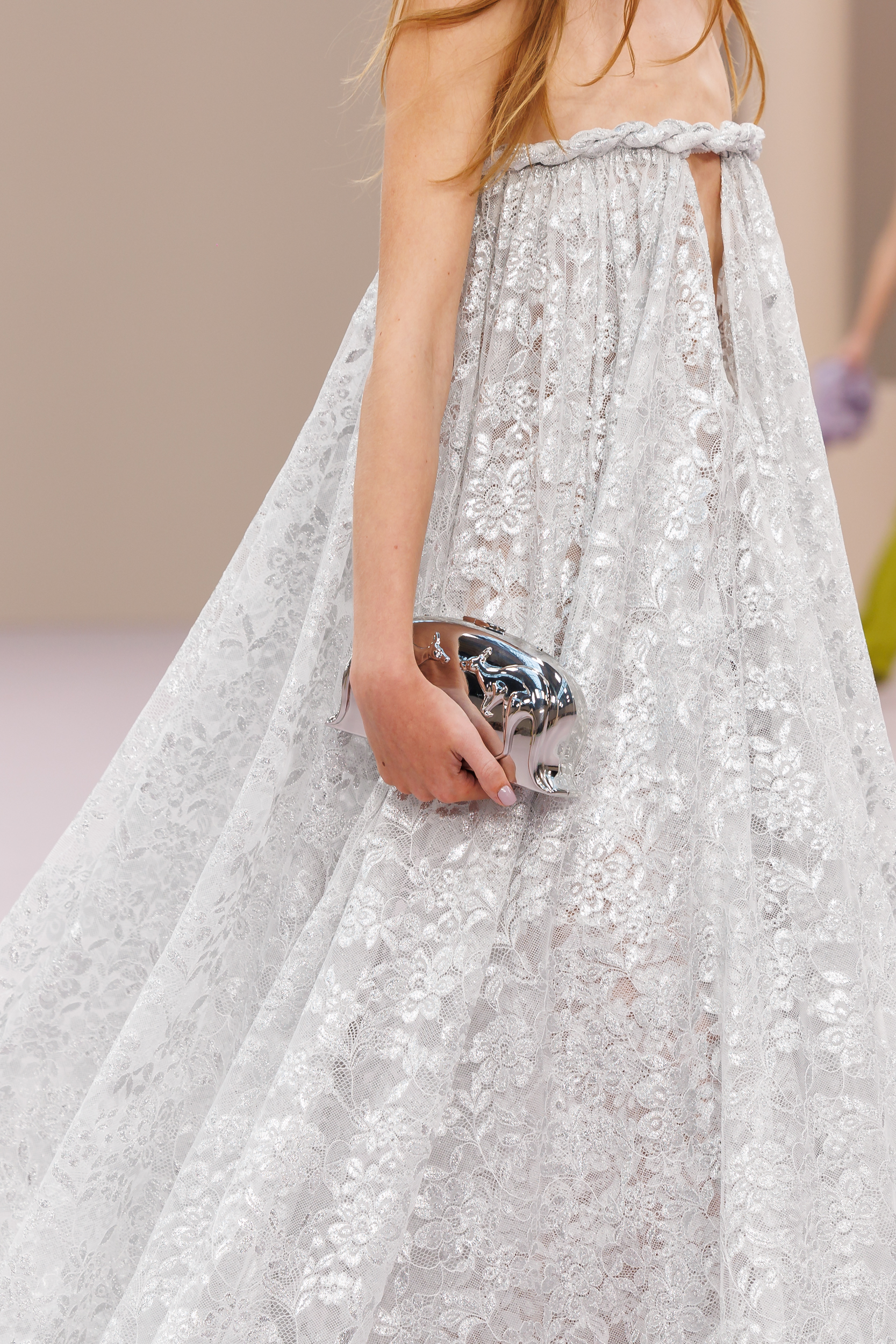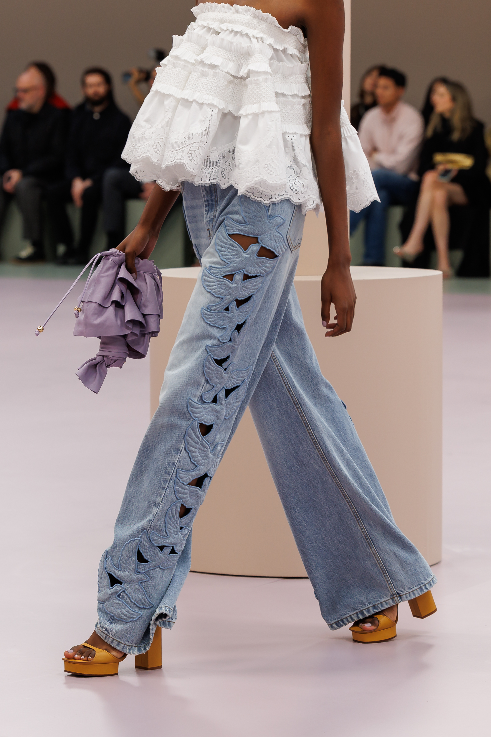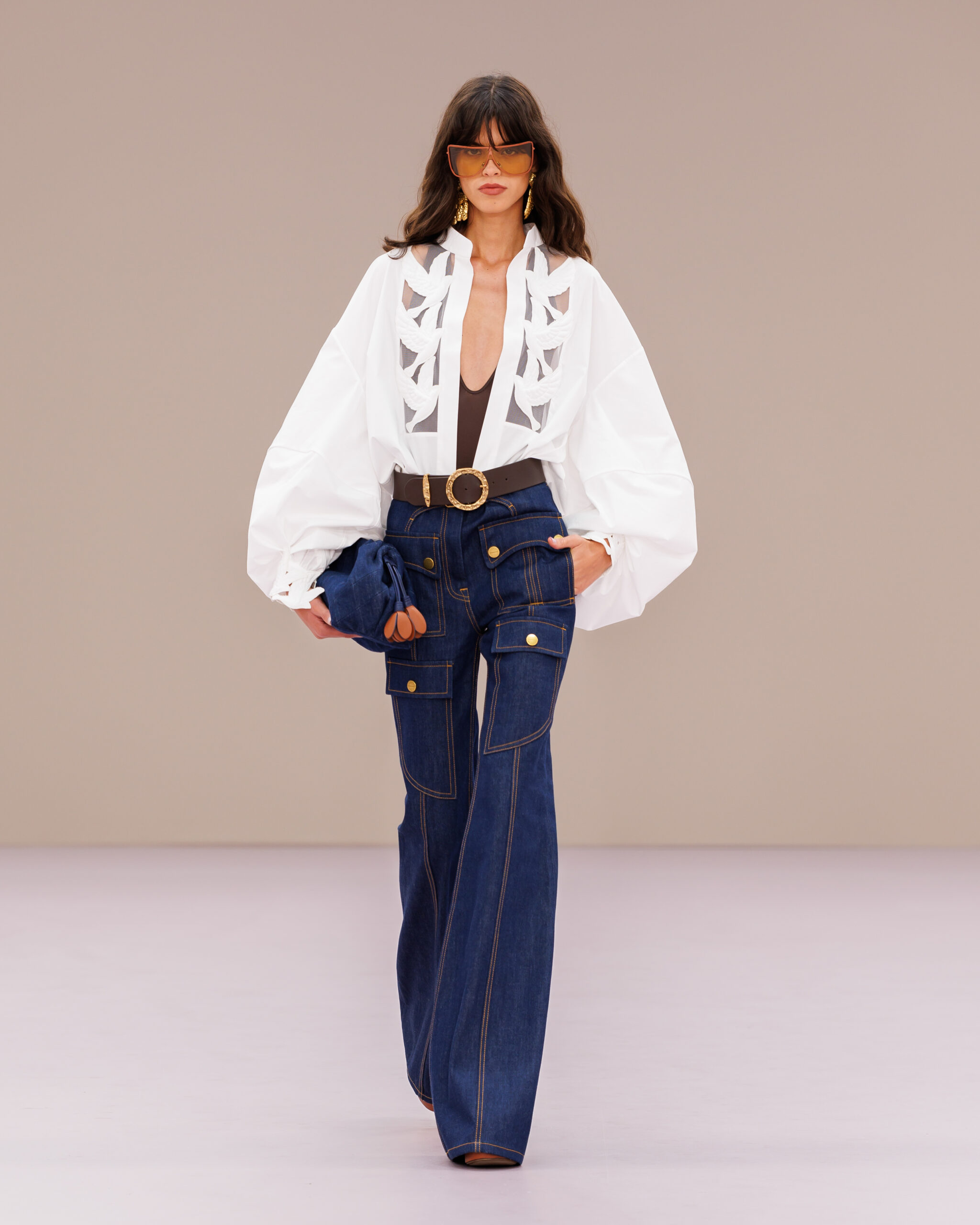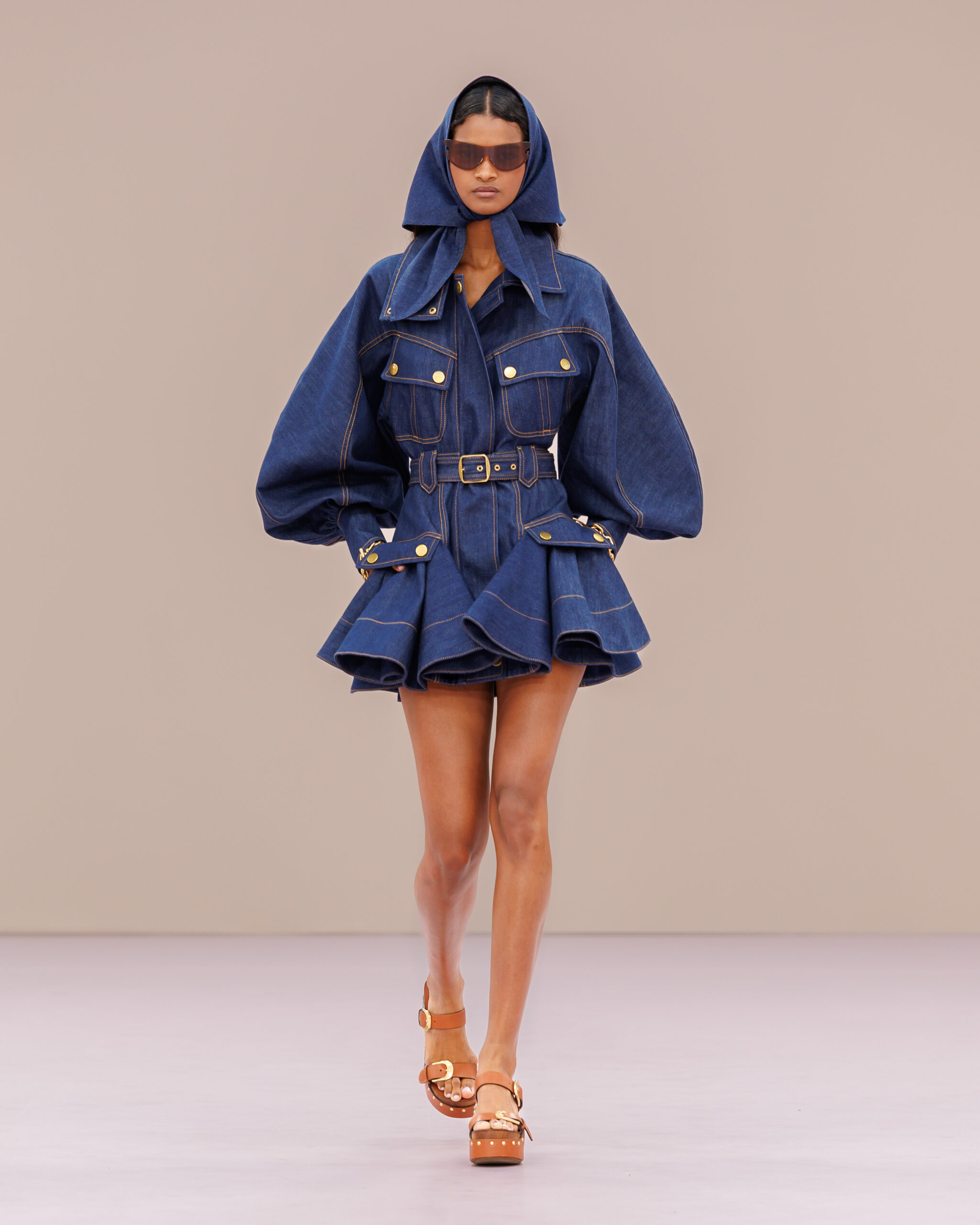 Zimmermann continues to innovate in denim, translating Ready-to-Wear codes into styles that are equal parts directional and contemporary — traversing between the everyday and occasion wear. Bird motifs recurring in the show have been embroidered, hand-stitched and cut away in an asymmetric denim midi dress and a pair of panelled jeans.