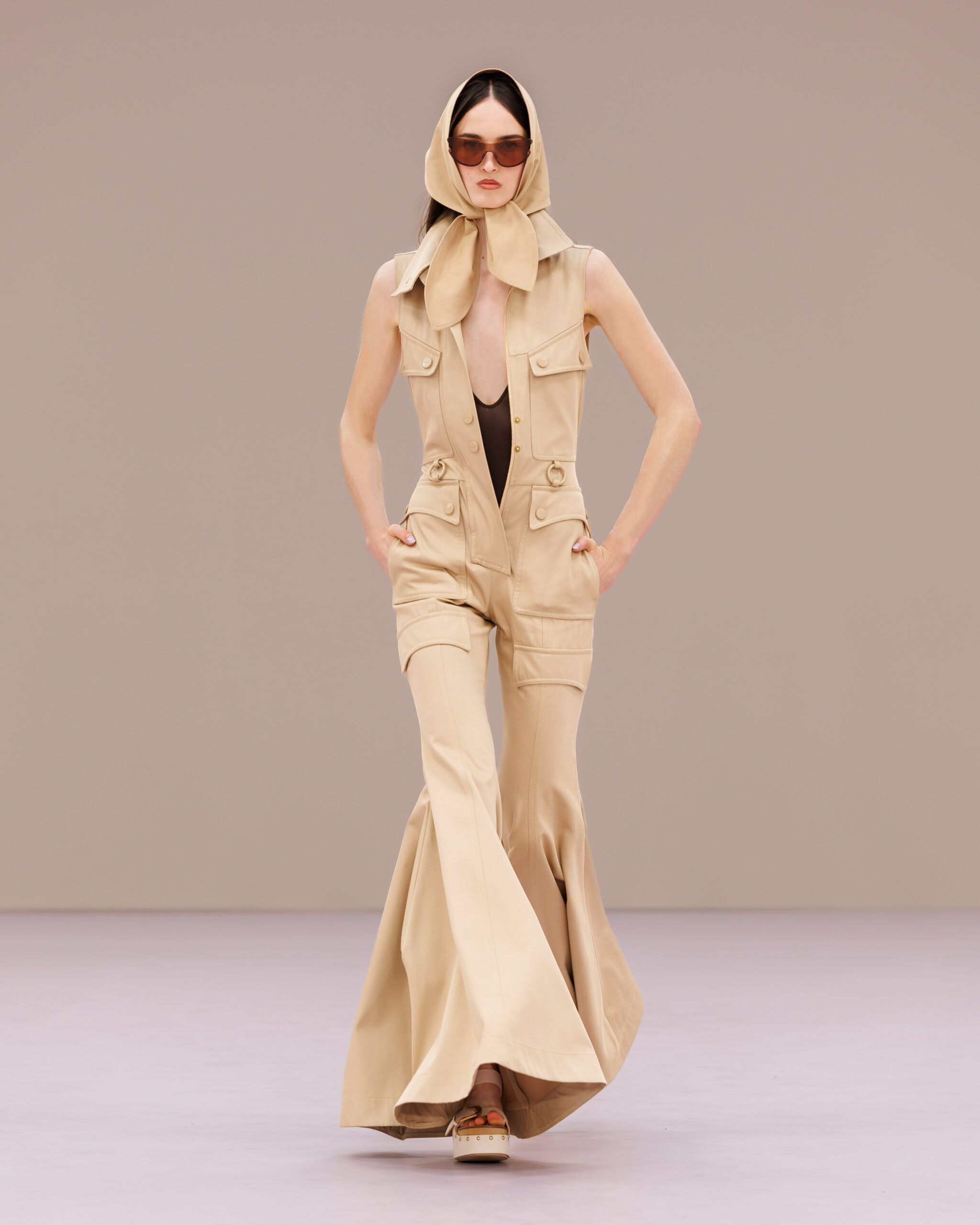 Iterations of painter’s overalls appear in cotton twill and tan leather, revealing a plunging bodysuit, a familiar Zimmermann layering piece. Wool suiting in head-to-toe 70s inspired colours comes in a shrunken vest worn with micro-shorts, their hemline playfully matched by a sharp blazer.