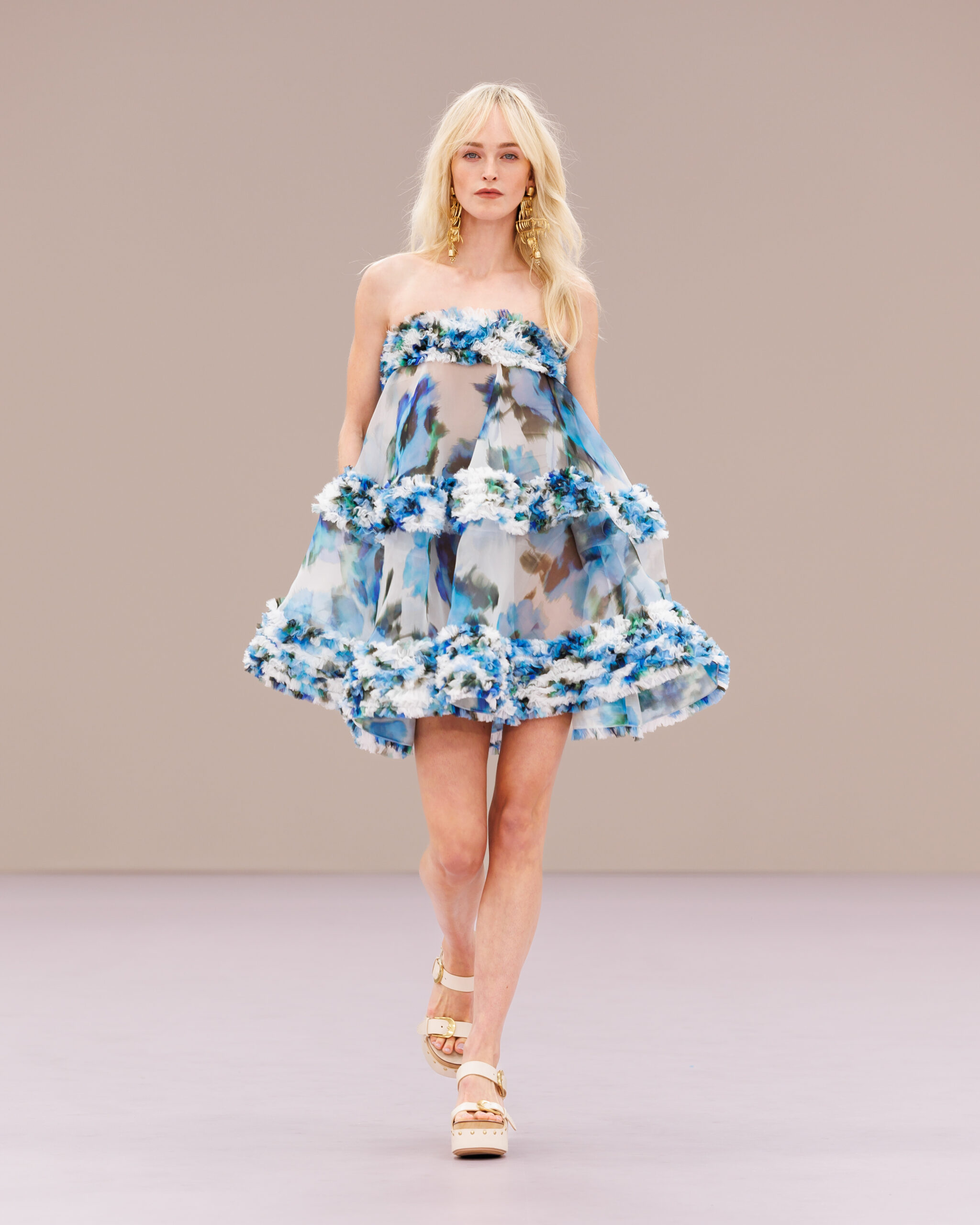 The show’s opening look captivates with its cascading silhouette, true to Zimmermann’s codes of considered volume and dramatic movement. Skirts shoot out from the waist, commanding space; sleeves billow into capes, strapless peplum tops float, and cylindrical flares bounce in step.