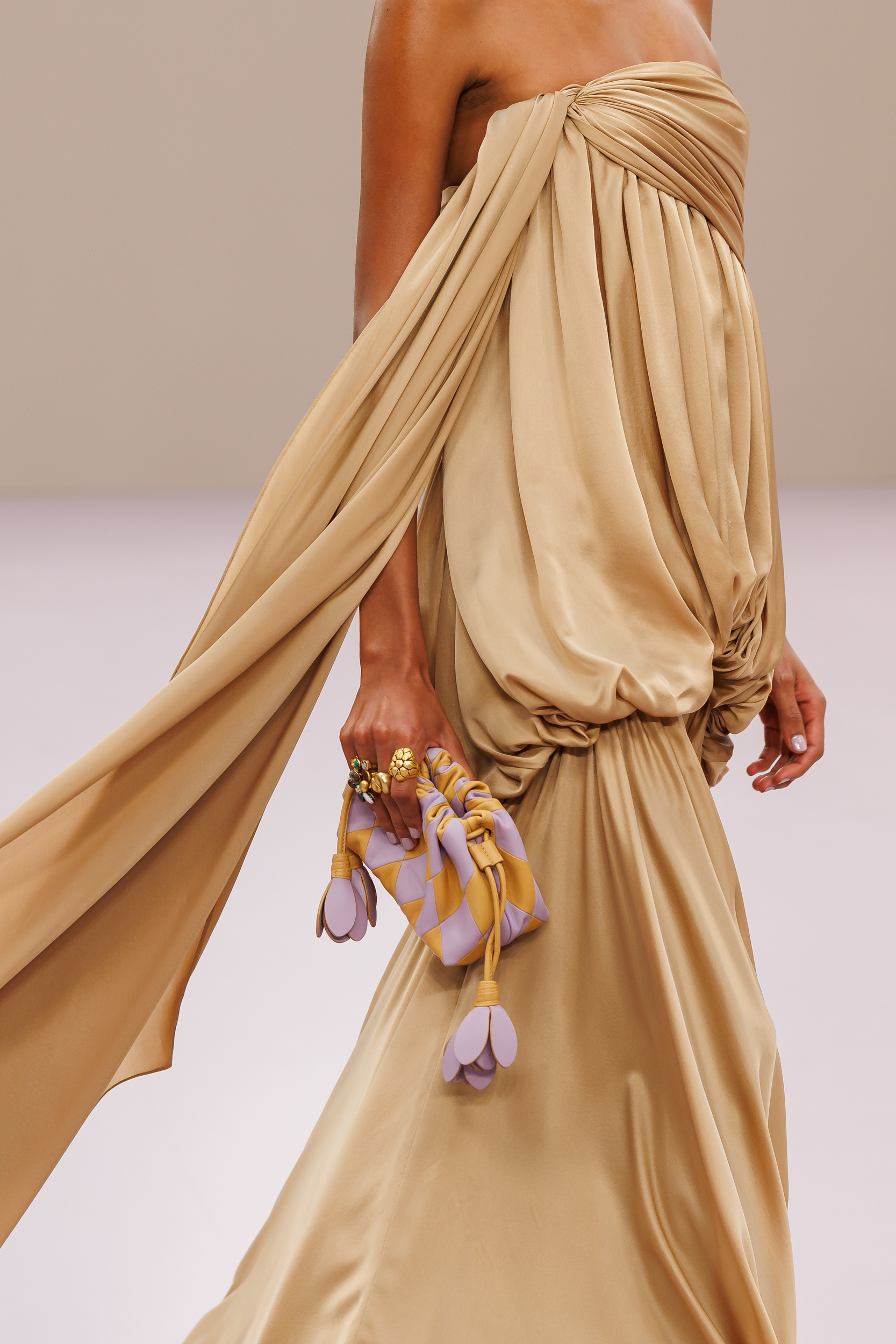 Accessories channel 70s nostalgia with a modern “more-is-more” elegance. Footwear features wooden platforms and leather sandals in diverse shades of tan, lilac, peach and mustard. Knotted floral fabric on raffia slides match impactful head-to-toe print looks. Drawstring leather bags are sewn together with colourful patchwork motifs. Eccentrically tiered bags are tied together in exaggerated knots. Fierce shield sunglasses dramatically juxtapose the soft 70s inspiration. Jewellery articulates Spring 26 Australian reference with koala figurines, on earrings and pendants, and golden statement pieces in the shape of native flora.